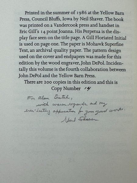 Limited edition 14/200 copies. This copy signed and warmly inscribed by Neil Shaver, publisher and founder of Yellow Barn Press: